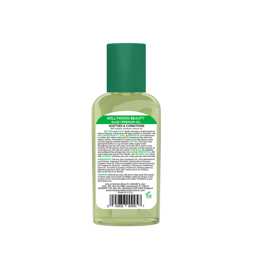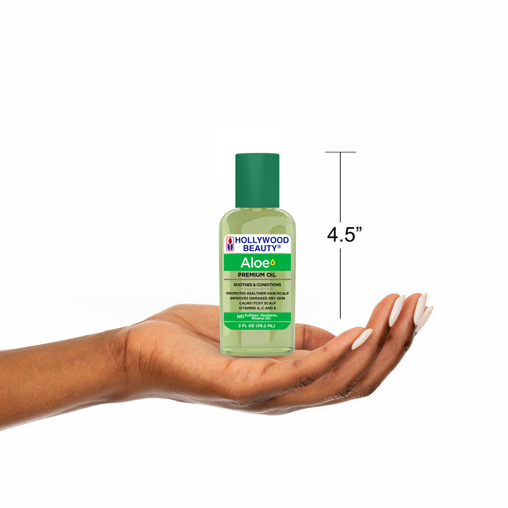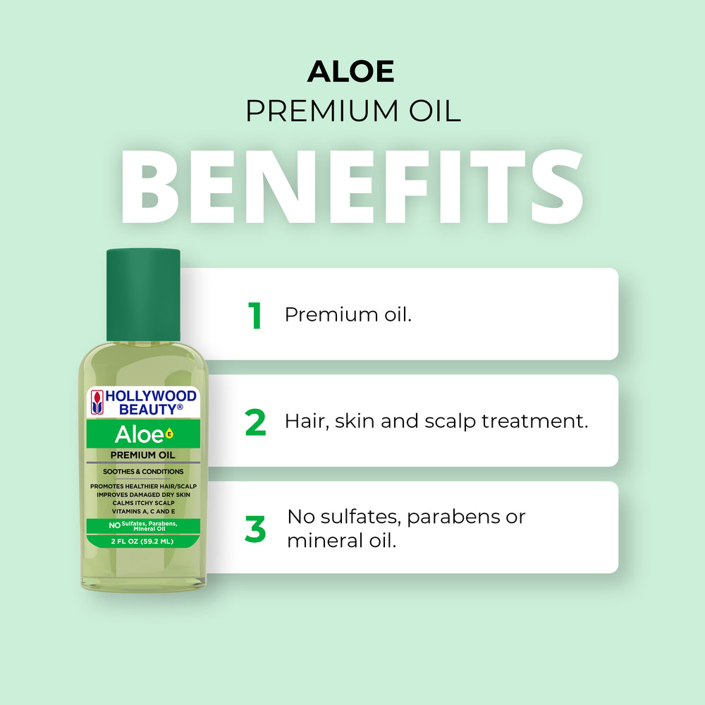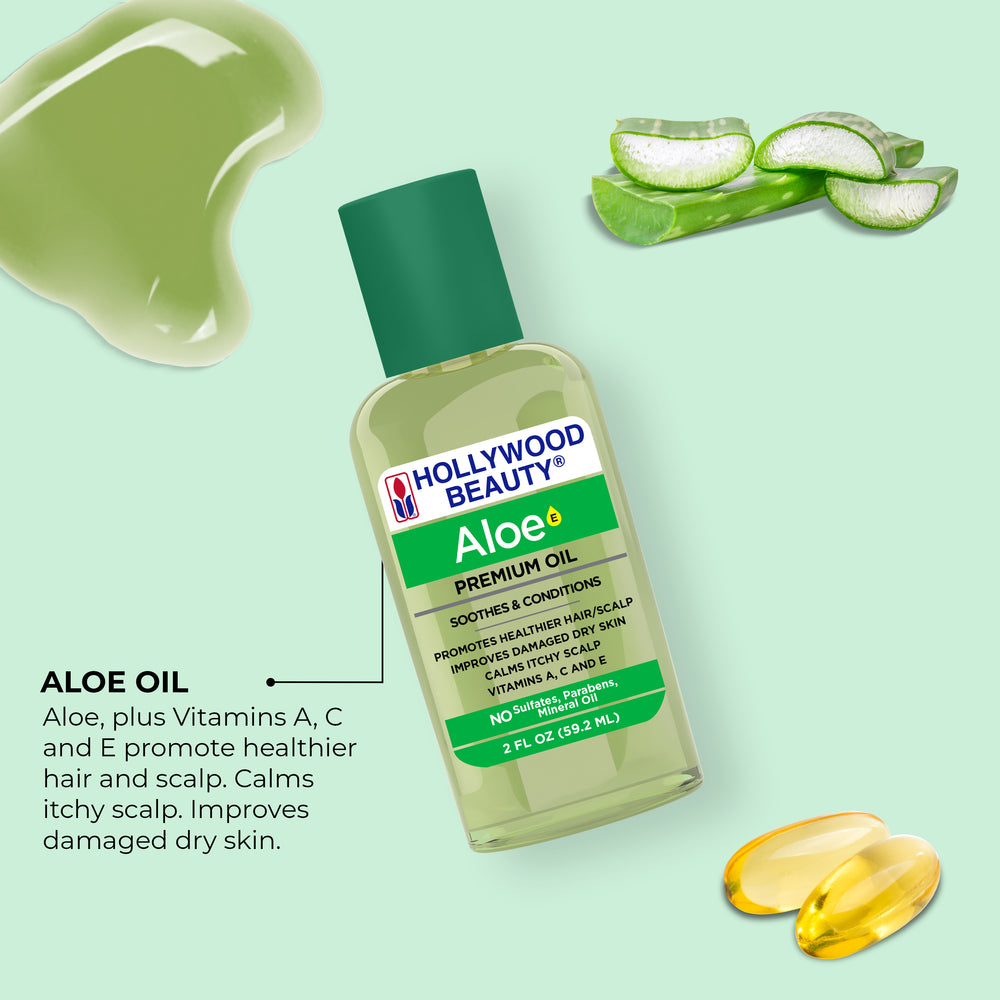 Hollywood Beauty Aloe Oil for Hair, Scalp, Skin, and Nails soothes and conditions the scalp, hair, skin, and even nails. Aloe, along with Vitamins E, A, and C, promote healthier hair and scalp, calms itchiness, and improves damaged, dry skin. Formulated with no sulfates, parabens, or mineral oil, it can be used as a natural way to soothe skin, relieve mild cases of Anhydrosis (dry skin), and reduce redness. This premium beauty oil is vital for total hair care, body care, and self-care.