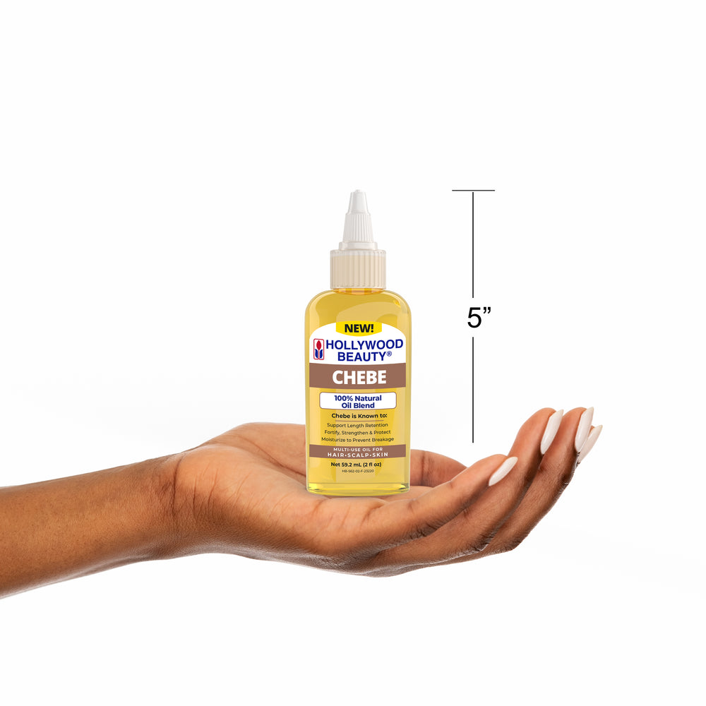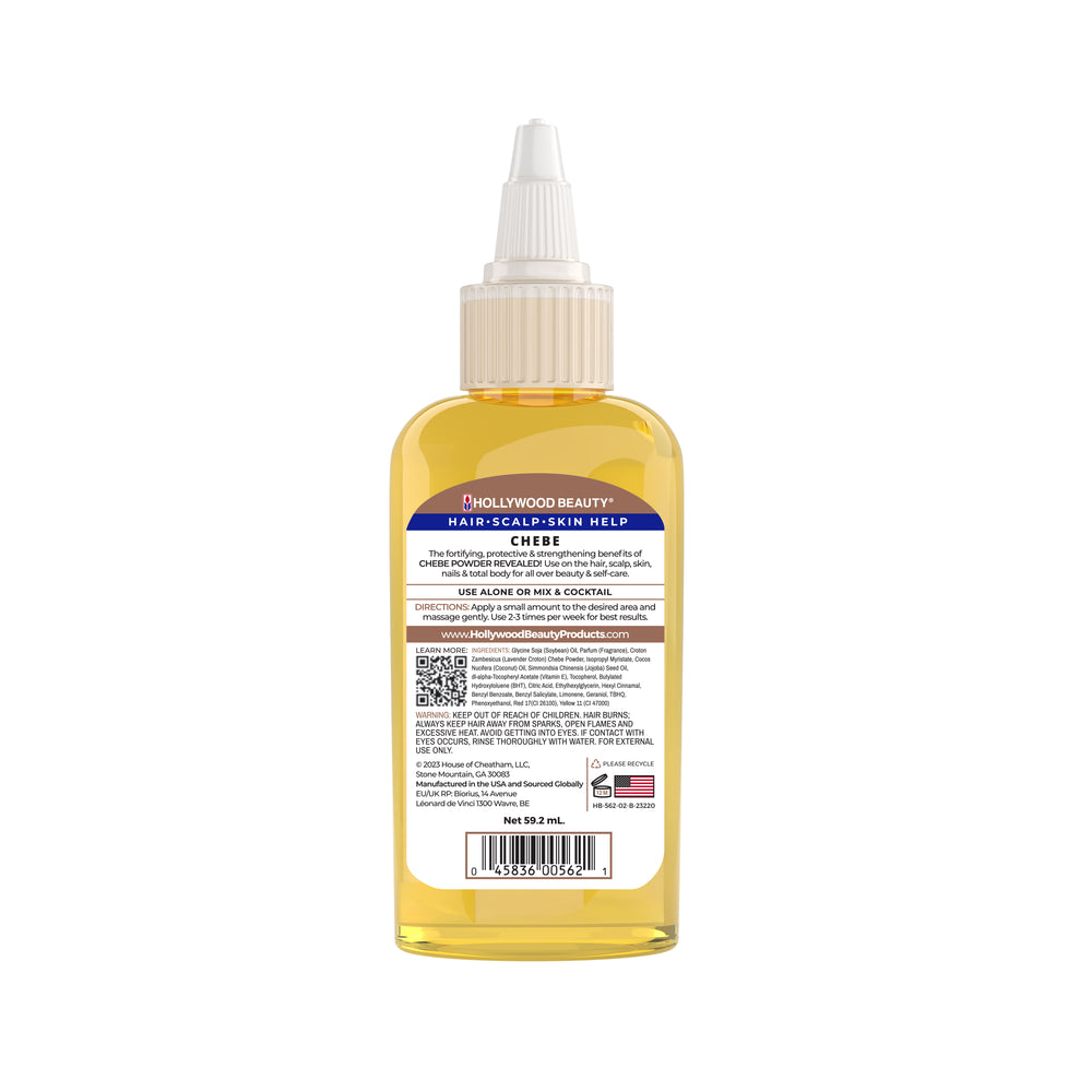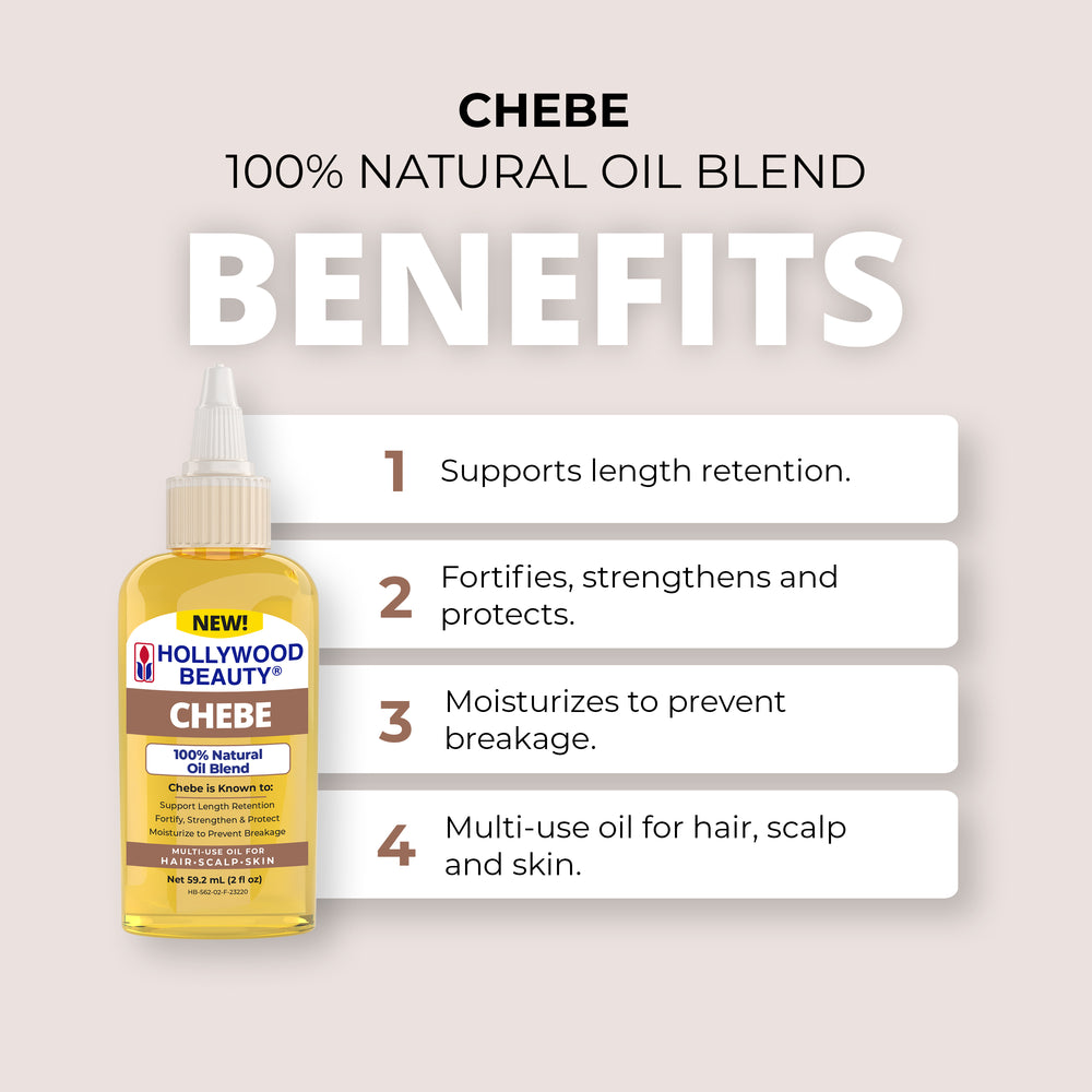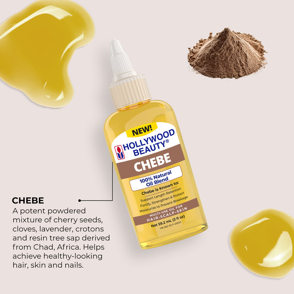 Hollywood Beauty Chebe Oil for Hair, Scalp, and Skin delivers growth boosting, fortifying, and beautifying benefits to the scalp, hair, skin, and even nails. Specially formulated with Chebe, this 100% natural oil blend is essential to achieving healthy-looking hair, skin, and nails. Traditionally, used in Chad, Africa, Chebe is a potent powdered mixture of cherry seeds, cloves, lavender, crotons, and resin tree sap. This powerful blend of ingredients helps protect, strengthen, and moisturize the hair. It also helps to retain hair length, while smoothing and strengthening skin and nails.