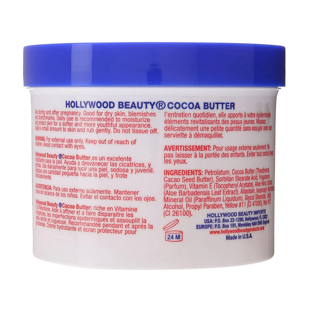 Hollywood Beauty Cocoa Butter Crème with Vitamin E is highly enriched with essential ingredients to soothe and smooth dry skin, blemishes, and stretch marks. Daily use is recommended to moisturize and protect skin for a softer and more youthful appearance. Recommended for use during and after pregnancy.