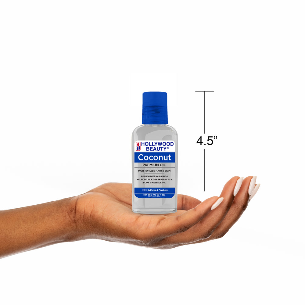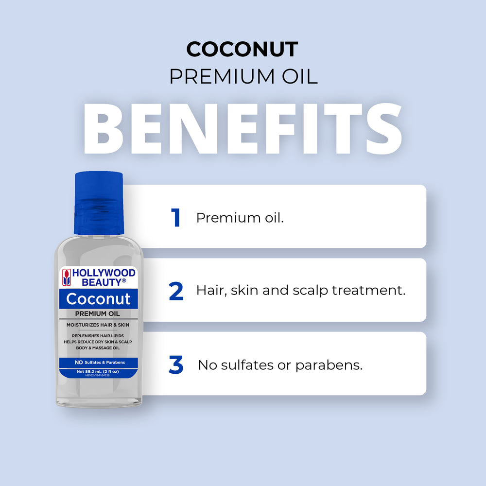 Hollywood Beauty Coconut Oil for Hair, Scalp, Skin, and Nails is enriched with vitamins that hydrate and moisturize the entire body. This premium oil hydrates and moisturizes your body, reducing dry skin. For your hair, it goes deep, offering intense conditioning and restoring moisture. Enjoy its delightful scent as a body and massage oil.
