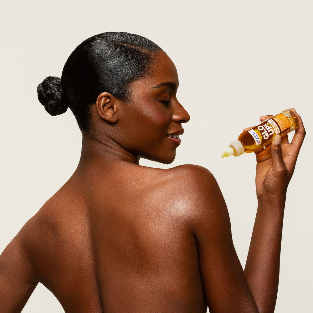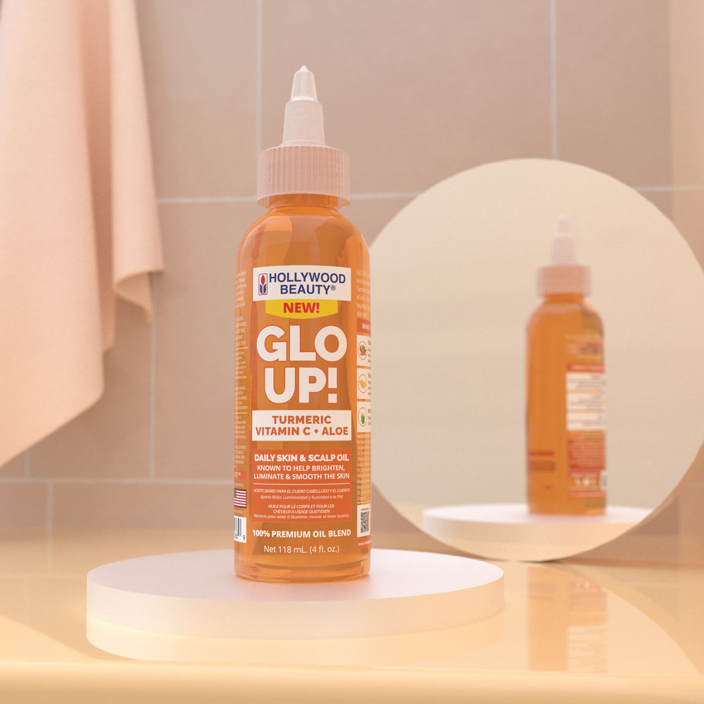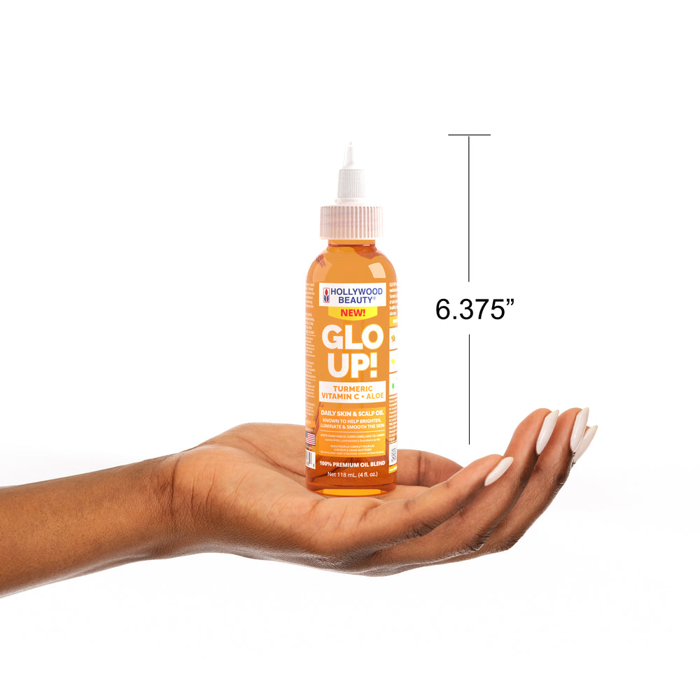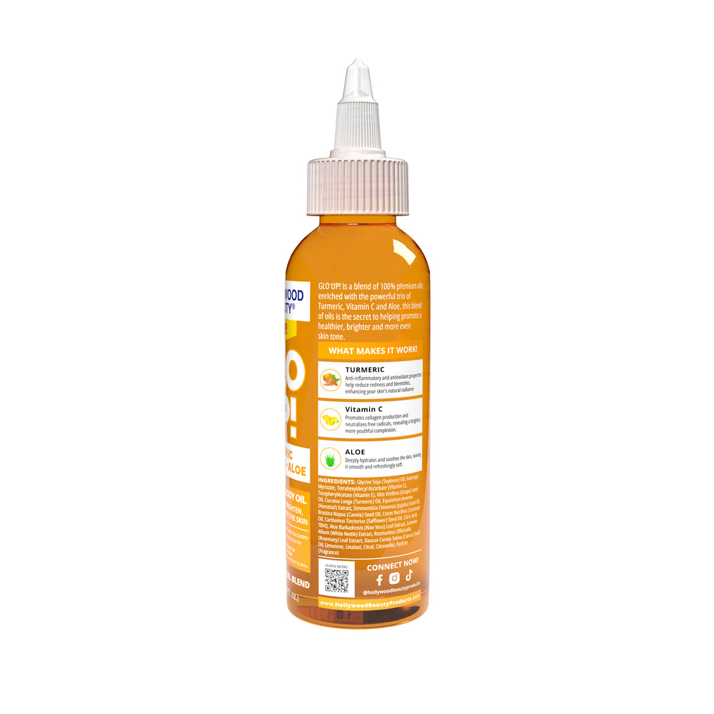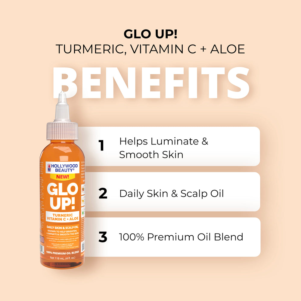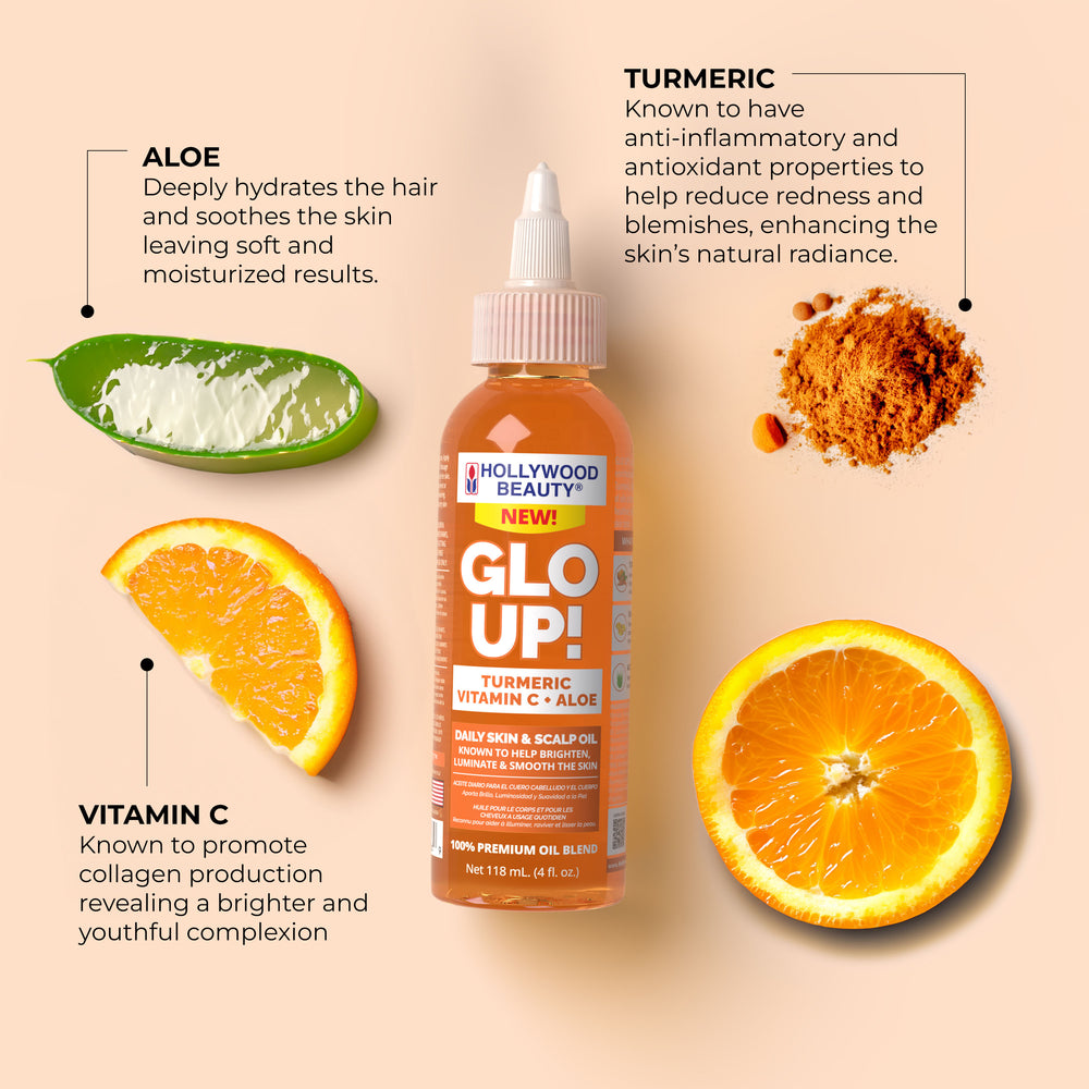 Give your skin a Dose of Beauty™ with Hollywood Beauty Glo Up! Turmeric, Vitamin C + Aloe Daily Skin & Scalp Oil. This 100% premium oil blend is enriched with the powerhouse trio of Turmeric, Vitamin C and Aloe, which is the secret to helping promote a healthier, brighter, glowing, and more even skin tone. Turmeric has anti-inflammatory and antioxidant properties to help reduce redness and blemishes, while enhancing your skin’s natural radiance. Vitamin C promotes collagen production and neutralizes free radicals, revealing a brighter, more youthful complexion. Aloe deeply hydrates and soothes the skin, leaving it smooth and refreshingly soft.
