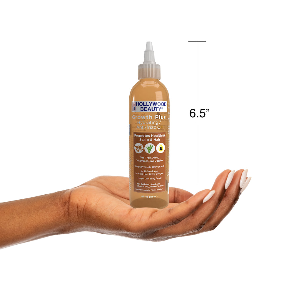 Hollywood Beauty Growth Plus Hydrating/Anti-Frizz Oil is the ultimate experience for hair and scalp care. Our nourishing formula made with Tea Tree Oil, Aloe, Vitamin E, and Jojoba. Designed to promote healthier hair, this treatment oil helps soothe dry, itchy scalp while supporting stronger, longer hair growth. Its anti-breakage properties work to reduce damage, so your hair can be soft and hydrated. Plus, it's designed with no mineral oils, sulfates, parabens or animal testing.