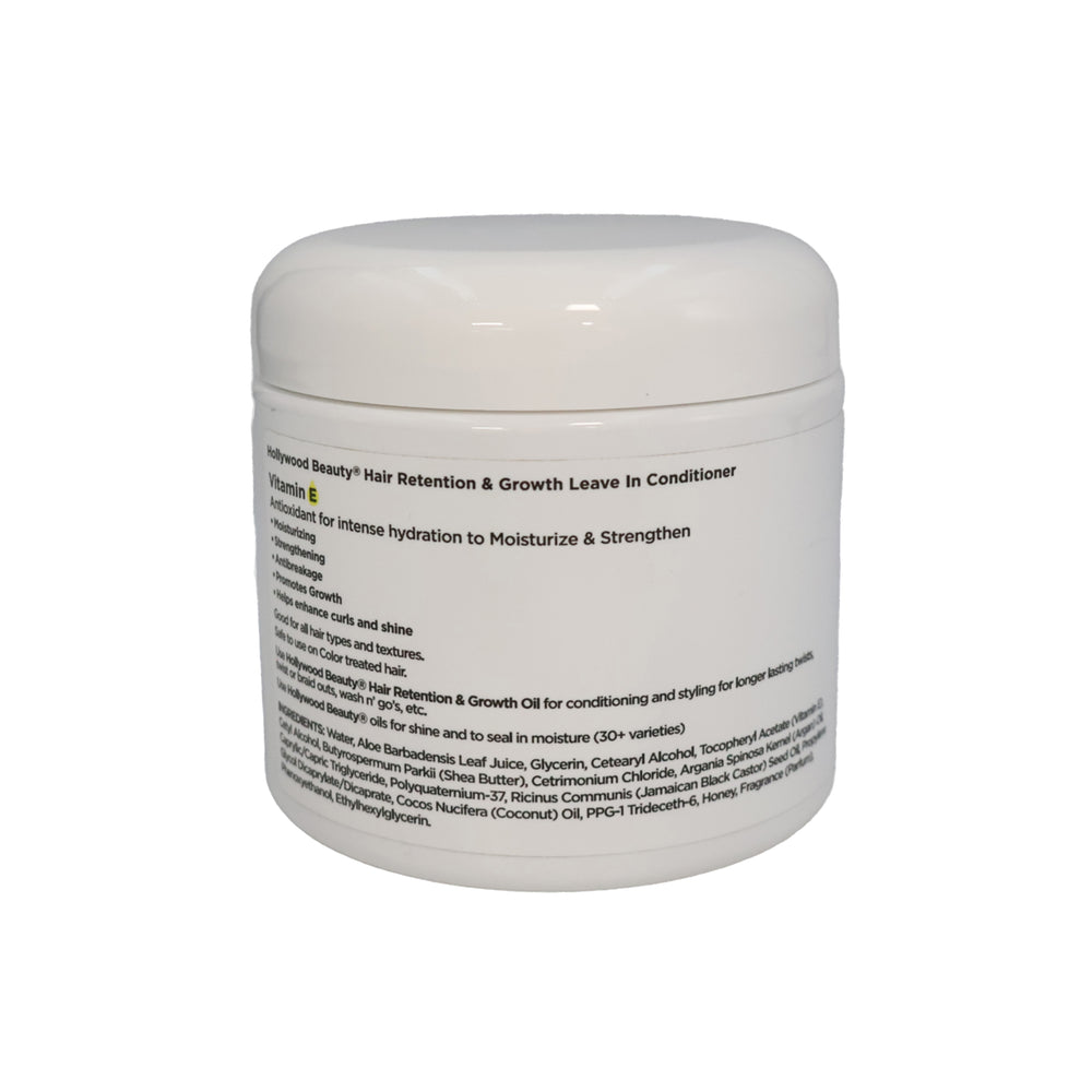 Hollywood Beauty Hair Retention & Growth Leave-In Conditioner is your best choice for moisturizing, styling, and promoting growth. This leave-in treatment is formulated to repair and moisturize dry, damaged hair. A natural blend of Vitamin E, fortified with 6 moisturizing, natural hair growth promoters - Aloe Leaf Juice, Shea Butter, Argan Oil, Jamaican Black Castor Oil, Coconut Oil, and Honey - creates a protective barrier around hair strands to help replenish natural oils stripped from hair. Good for all hair types and textures and safe to use on color-treated hair.