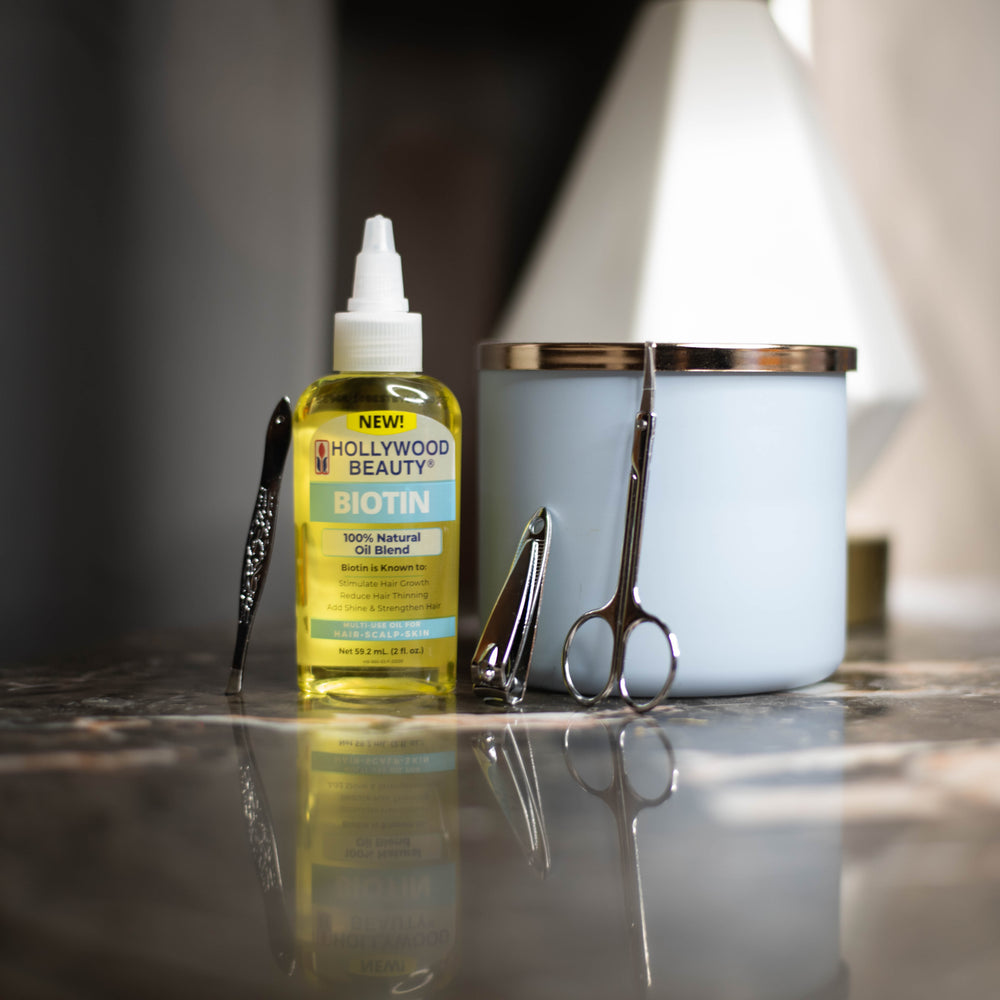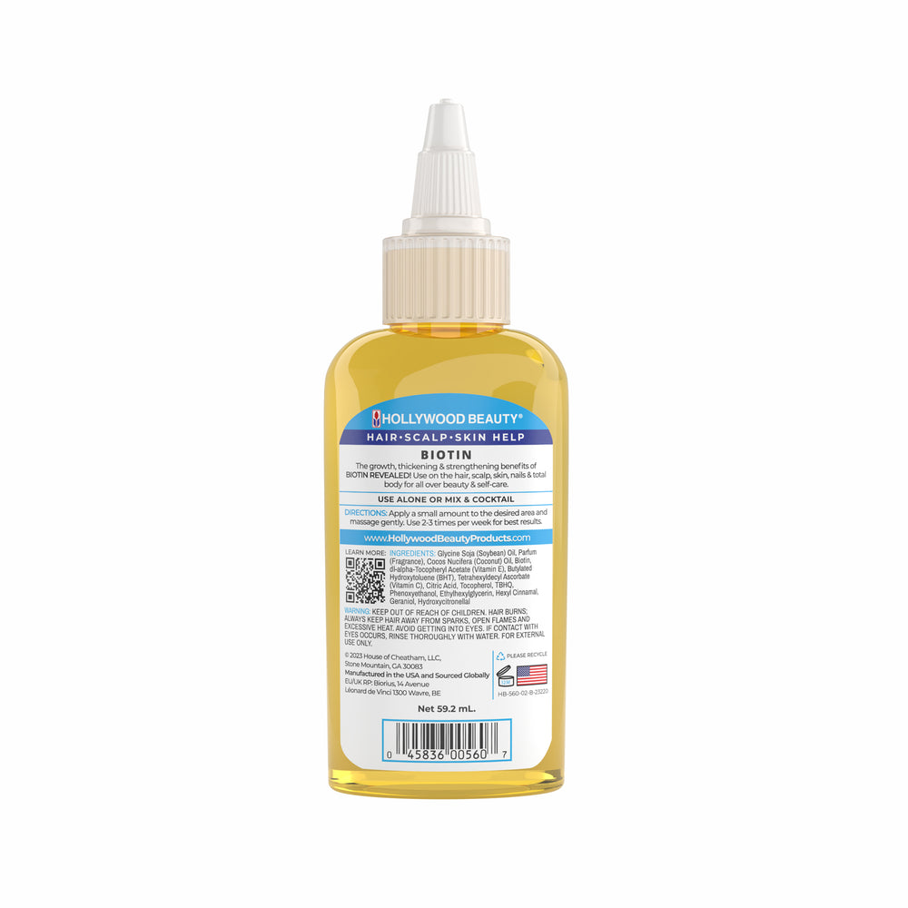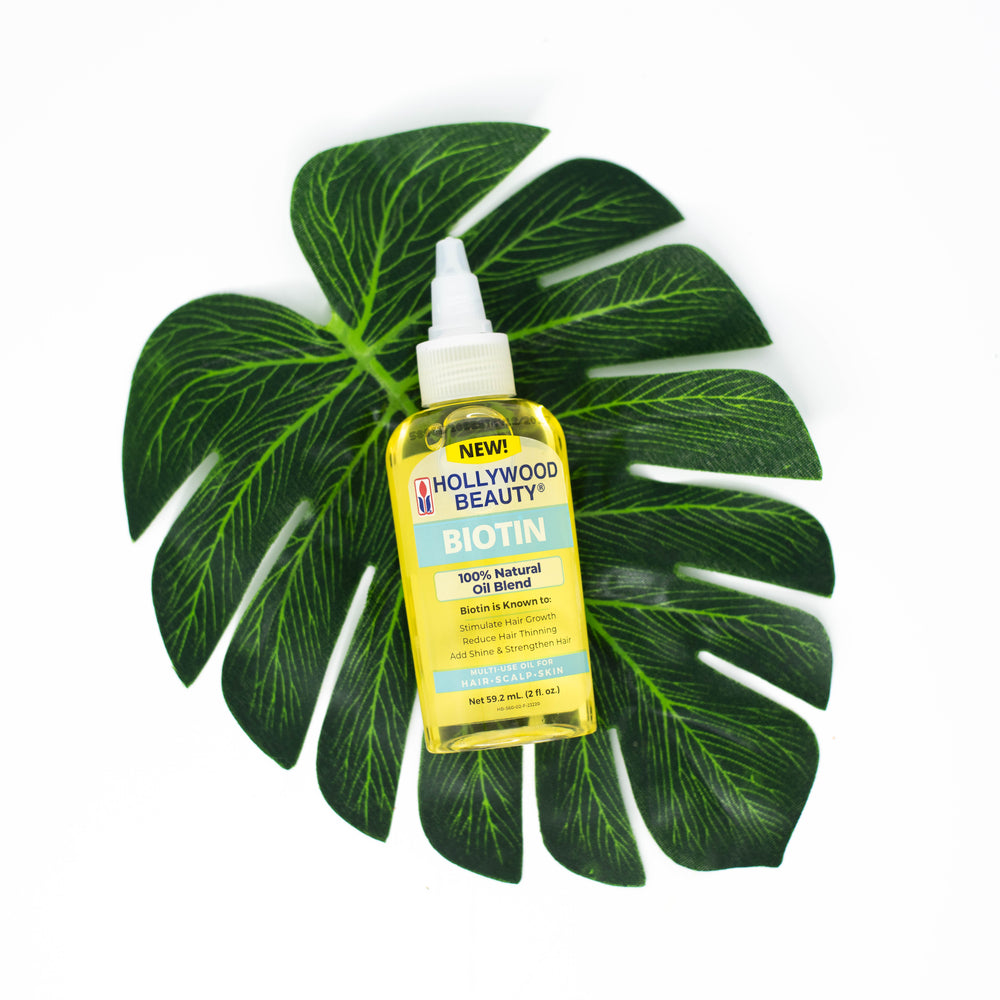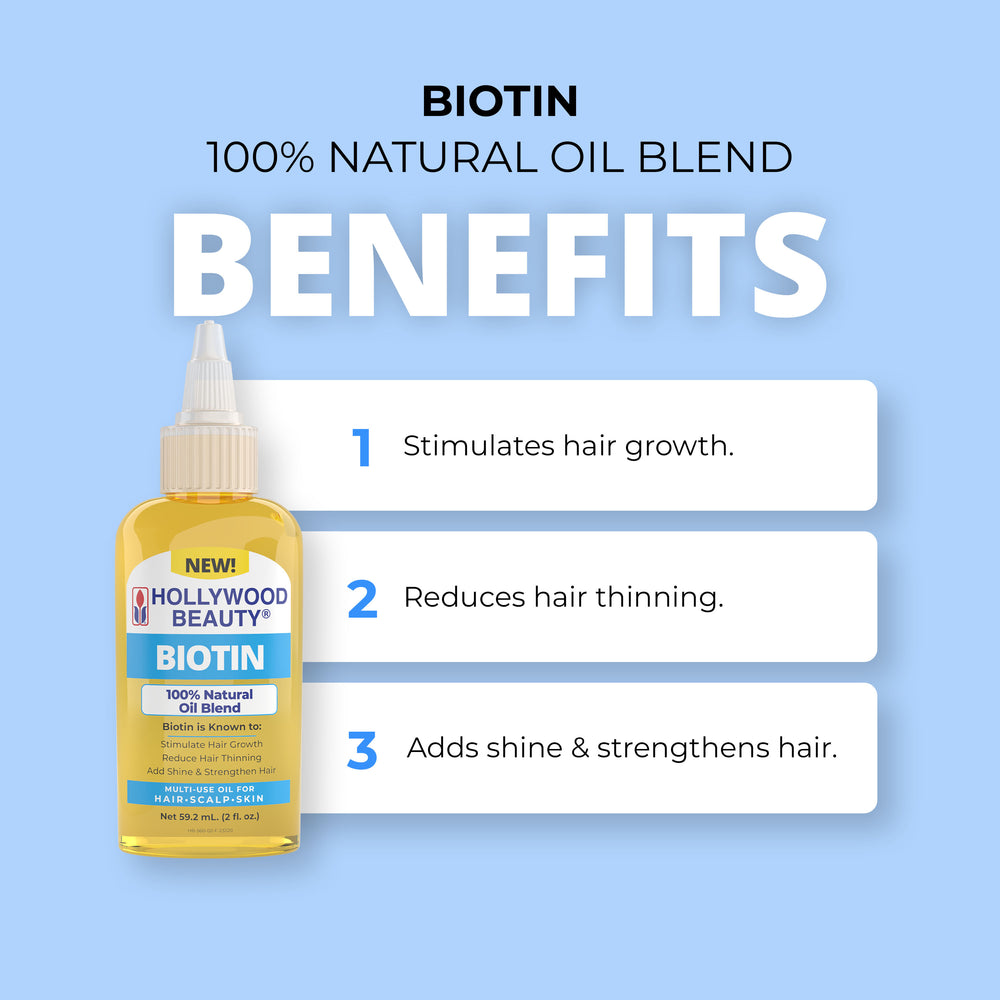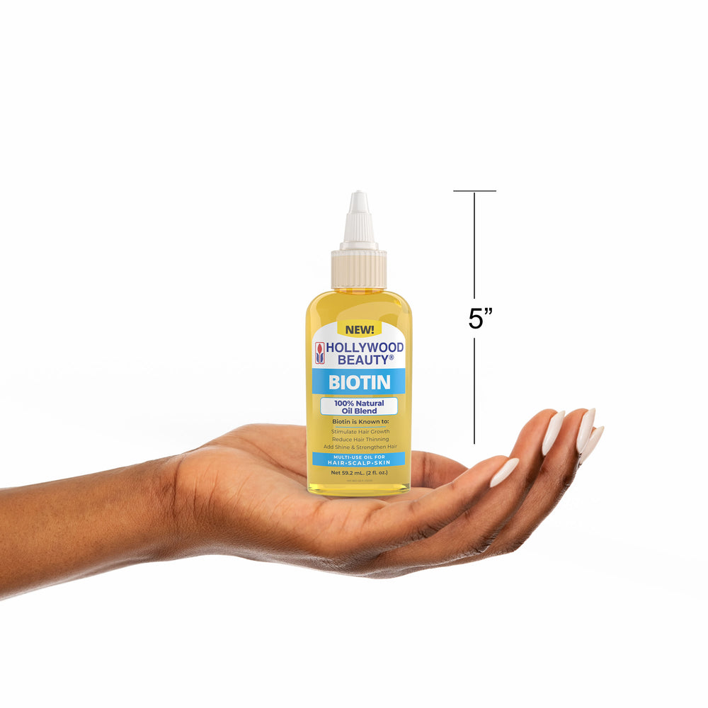 Hollywood Beauty Biotin Oil for Hair, Scalp and Skin delivers growth boosting, fortifying, and beautifying benefits to the scalp, hair, skin, and even nails. Packed with Biotin, the powerful Vitamin B7 nutrient, this 100% natural oil blend helps hair grow longer and fuller. It improves hair strength, as it is less likely to break off at the ends.