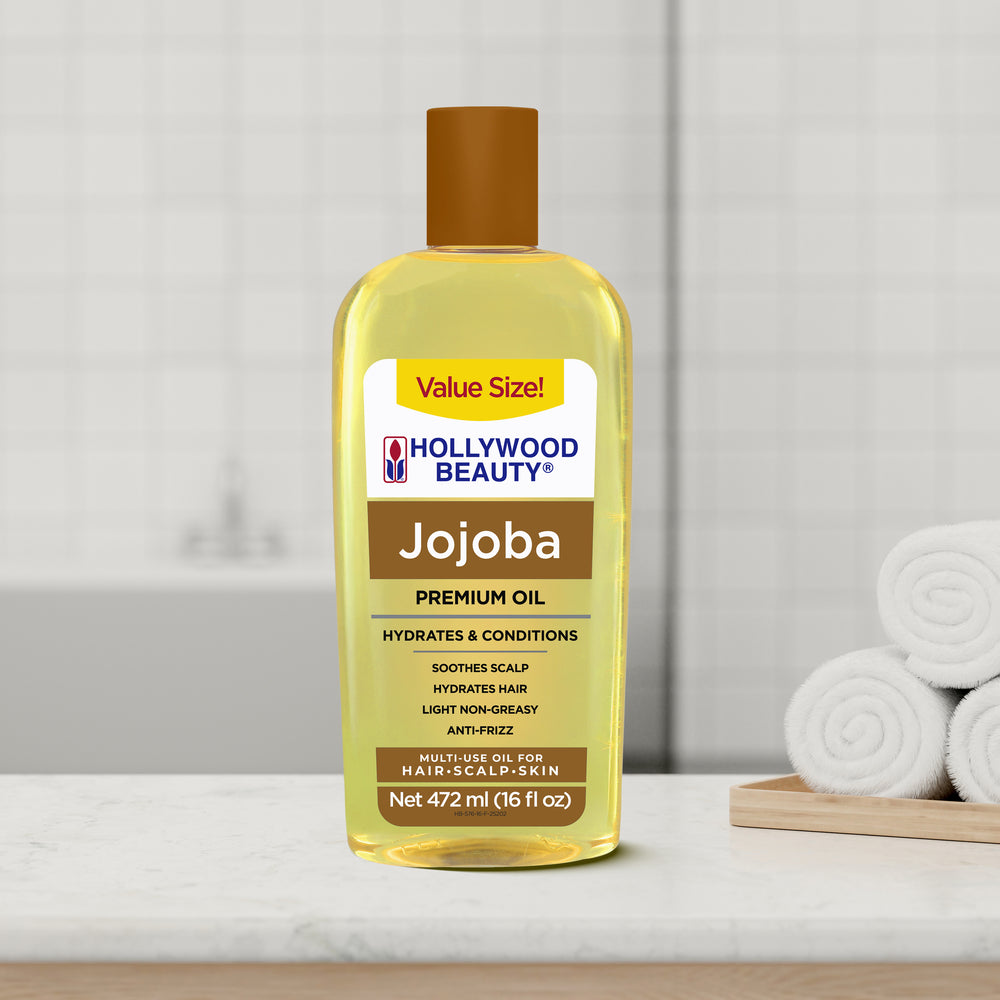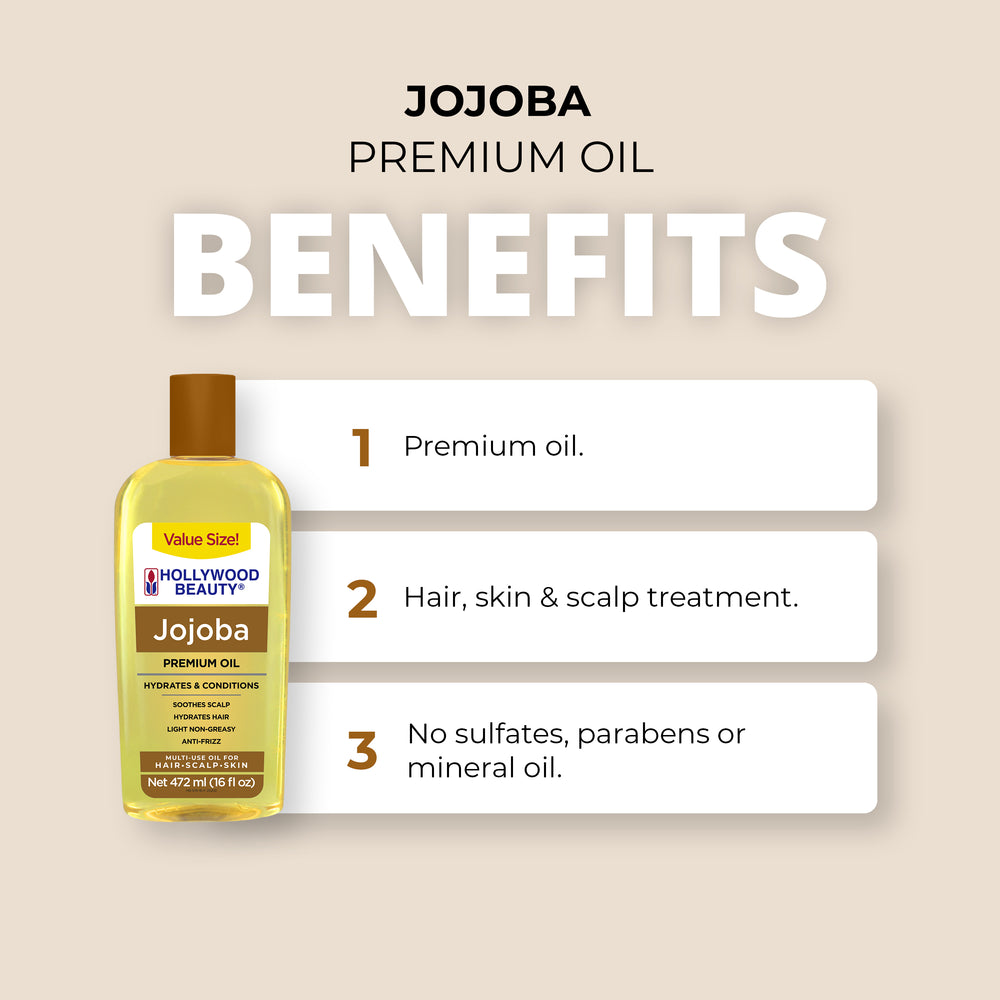 Hollywood Beauty Jojoba Oil for Hair, Scalp, Skin, and Nails hydrates and conditions all over. Jojoba soothes the scalp and hydrates hair from the inside of the hair shaft. It works well as an anti-frizz fighter and agent for reducing hygral fatigue, which is the swelling and shrinking of hair as it gets wet and dries, which can weaken the hair fibers over time. Formulated with no sulfates, parabens, or mineral oil, this light, non-greasy beauty oil is vital for total hair care, body care, and self-care.