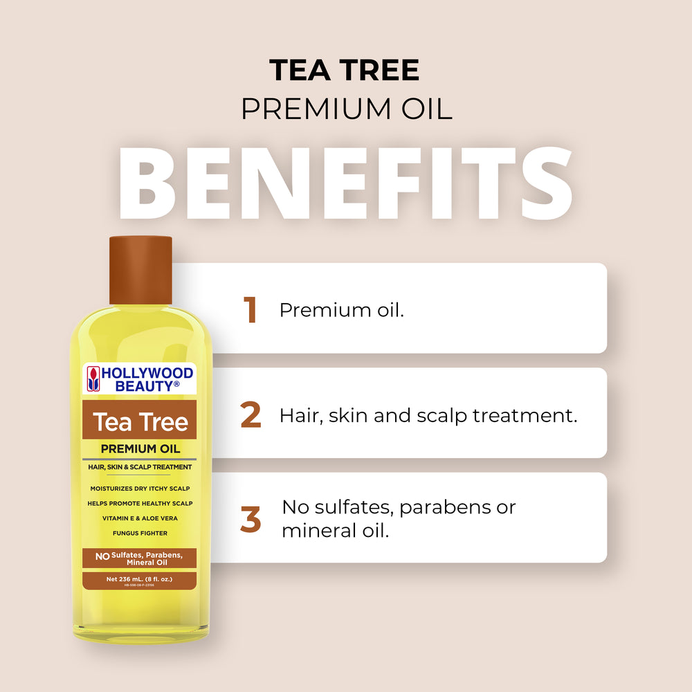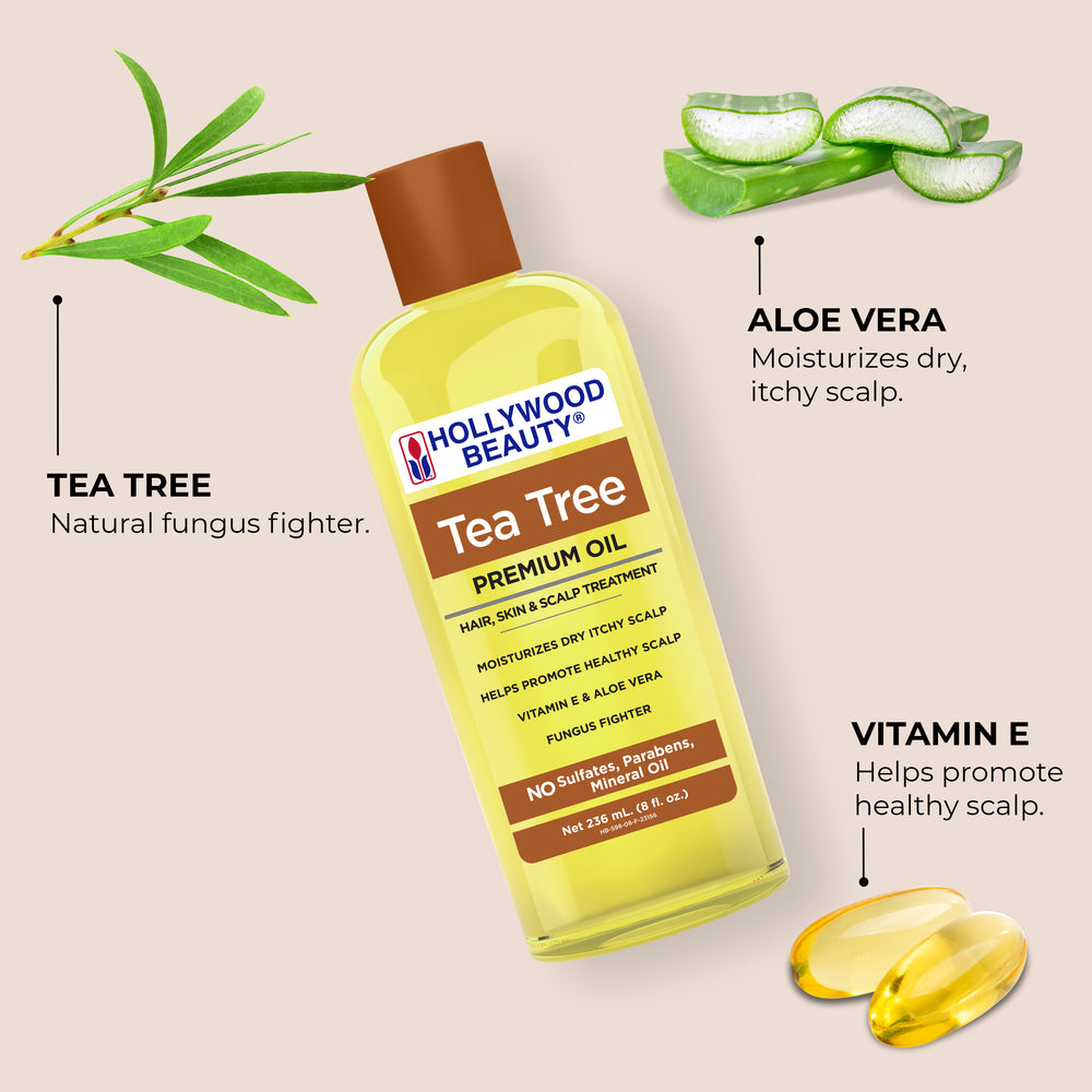 Hollywood Beauty Tea Tree Oil has numerous beneficial effects, as a natural antiseptic for mild cases of dry skin, and as a fungus fighter. This premium oil also contains Vitamin E, Aloe Vera, and other natural oils, to moisturize the scalp and skin while promoting hair growth and scalp healing.