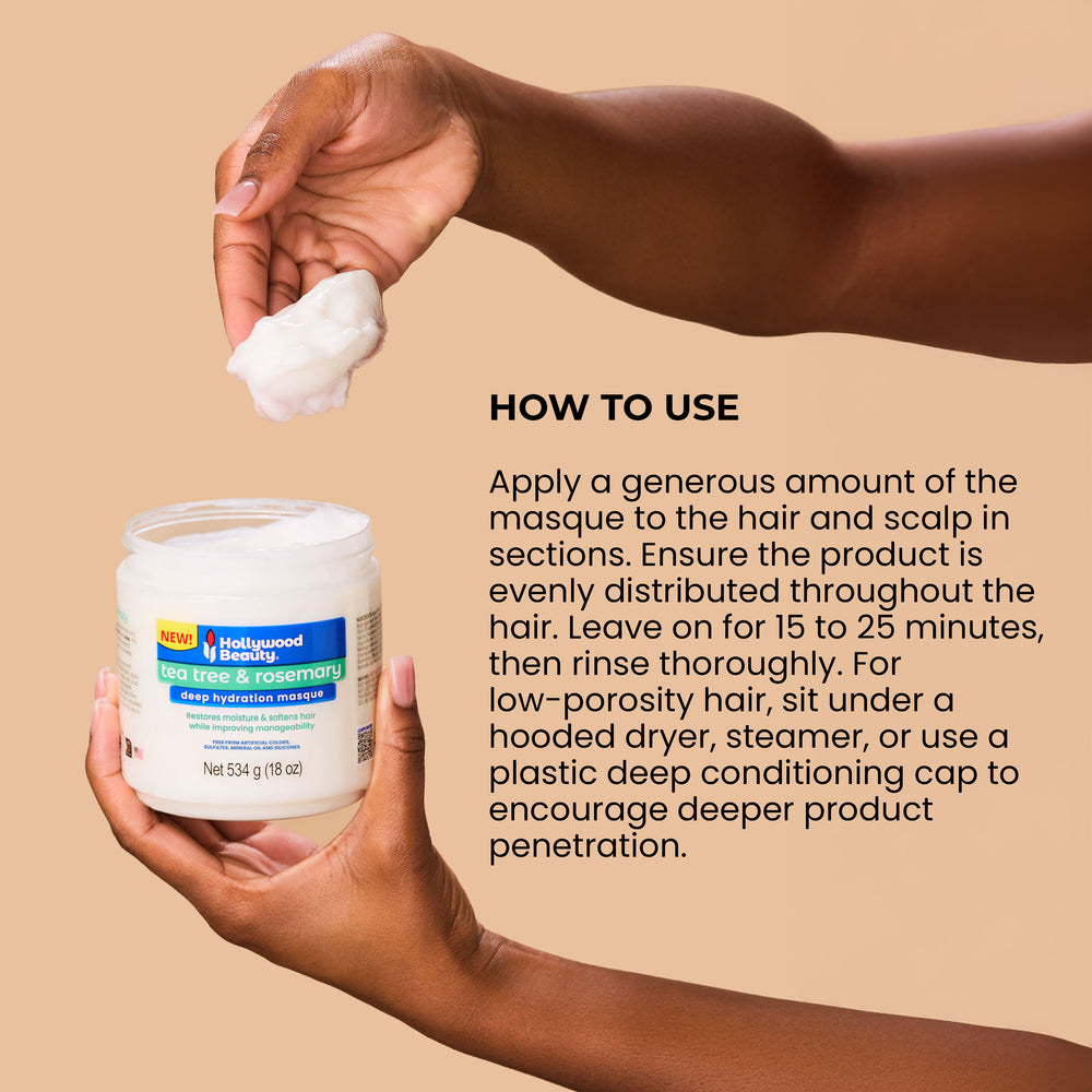 After cleansing the hair and scalp with Hollywood Beauty Tea Tree & Rosemary Shampoo, apply a generous amount of the masque to the hair and scalp in sections. Ensure the product is evenly distributed throughout the hair. Leave on for 15 to 25 minutes, then rinse thoroughly. For low-porosity hair, sit under a hooded dryer, steamer, or use a plastic deep conditioning cap to encourage deeper product penetration.