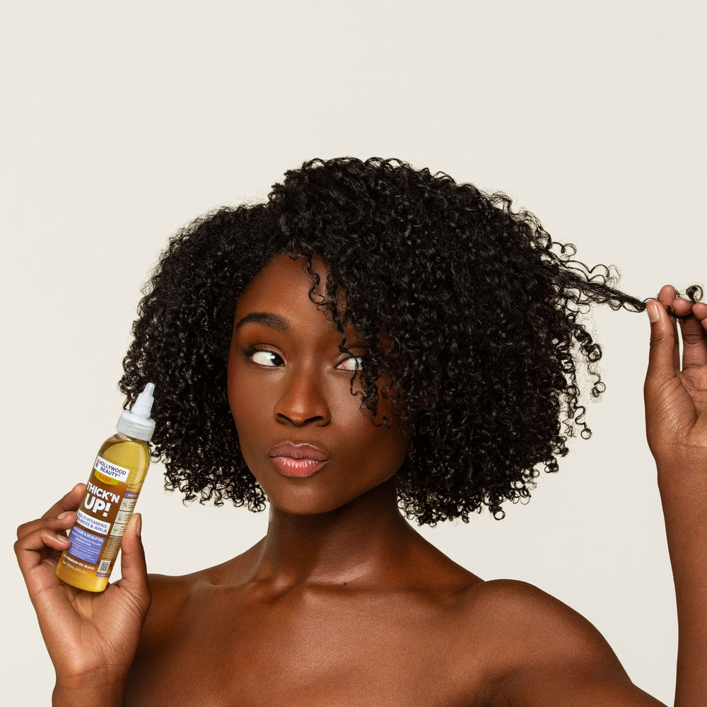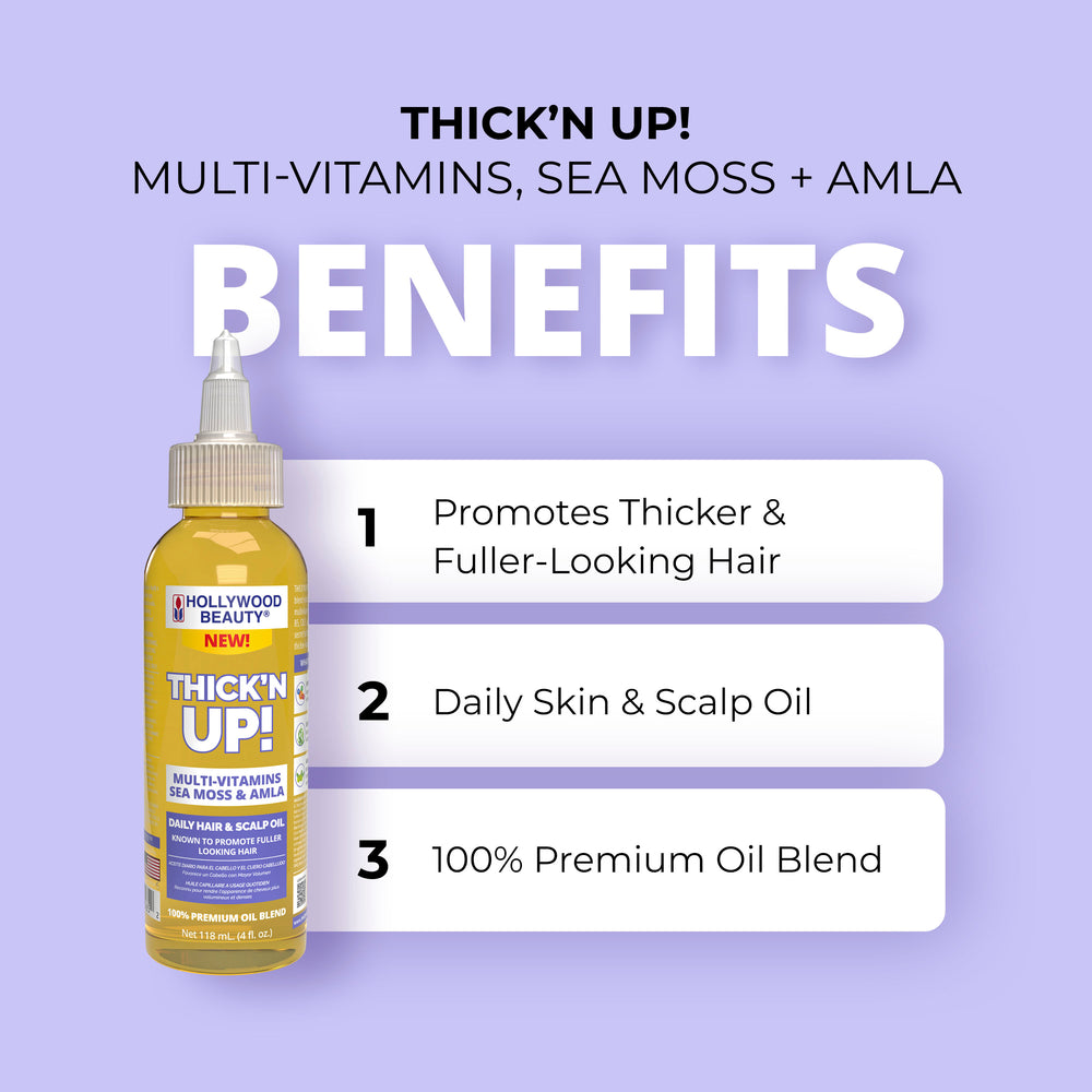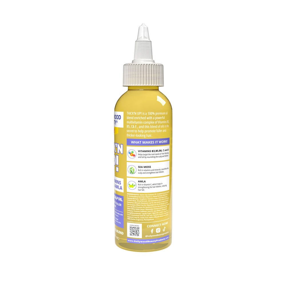 Give your hair a Dose of Beauty™ with Hollywood Beauty Thick’N Up! Multi-Vitamins, Sea Moss & Amla Daily Hair & Scalp Oil. This 100% premium oil blend is packed with a powerful multi-vitamin complex of Vitamins B3, B5, C & E, along with a blend of Sea Moss and Amla oils, which are the secrets to help promote fuller and thicker-looking hair. Vitamins B3, B5, C & E help target the root causes of hair thinning and nourish the scalp and follicles. Sea Moss is rich in vitamins and minerals, nourishes the scalp, and strengthens hair follicles. Amla is rich in Vitamin C, which helps in strengthening the hair follicles and reducing hair fall.
